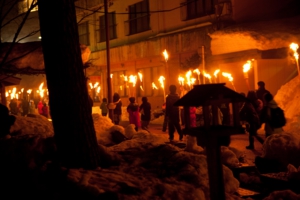 宇奈月温泉で毎年冬に行われる冬のカーニバル大勢の人々がたいまつをもって温泉街を練歩くのは圧巻です。