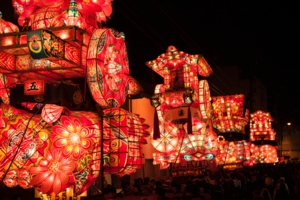 南砺市福野で行われる夜高行灯です。深夜祭りは最高潮を迎え激しいぶつかり合いが見所です。
